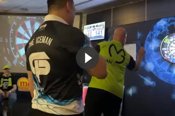 Die boete is inmiddels al voldaan en donderdagavond stonden de twee alweer tegen elkaar en dat ging niet onverdienstelijk. The Iceman trakteerde de Nederlander namelijk op een 9-darter en op een demo-avond moet dat natuurlijk worden gevierd zoals te zien is op