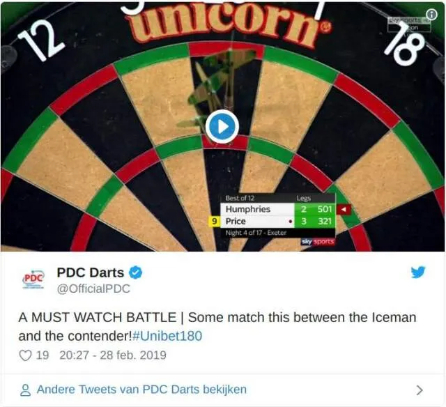 Gerwyn Price verkeerd op dit moment in de vorm van zijn leven. Afgelopen weekend was hij iedereen de baas met een dubbele winst op de Players Championships. Vanavond opende hij de Premier League-avond en wederom liet hij zijn beste spel zien. In de 6e leg stond hij ruim 105,00 gemiddeld te gooien toen zich onderstaand moment voordeed.