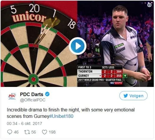 Daryl Gurney wist donderdagavond in een allesbeslissende laatste leg de halve finale van de World Grand Prix te bereiken. Na de winnende pijl zakt hij door zijn knieën en kan hij zijn emoties niet meer de baas blijven uit vreugde. Thornton is echter woedend en verlaat direct het podium. Volgens de beelden die op televisie waren uitgezonden leek het erop dat een felicitatie aan het adres van Gurney er zelfs niet in zat. Dit bleek echter toch iets anders te zitten zoals blijkt uit onderstaande beelden.