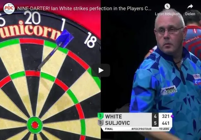 Ian White viel op zondag in de finale en dus zijn hier wel beelden van. Zie hieronder een geweldige eindstrijd met de 9-darter van Dab Diamond.