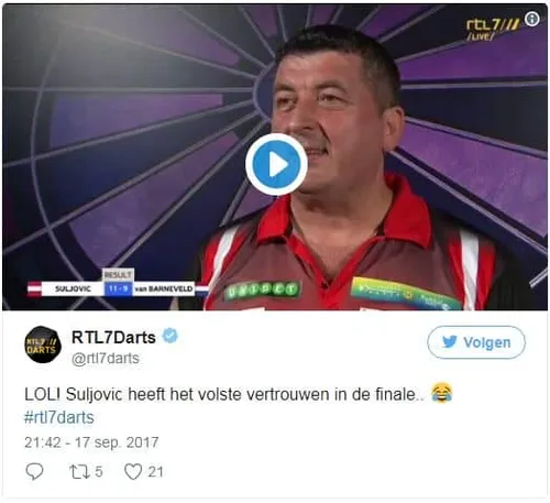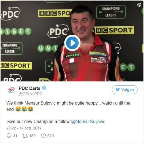 Mensur Suljovic is de eerste winnaar van een groot PDC televisietoernooi die de Engelse taal niet machtig is. Daar waar Michael van Gerwen in zijn jonge jaren ook enige moeite kende in het Engels en Christian Kist er zelfs een tolk voor nodig had, pakt Suljovic het anders aan. Wanneer hij de vraag niet begrijpt reageert hij er ook niet op maar haalt zelf iets aan om over te spreken. Dit leverde enkele hilarische interviews op waarbij de interviewer niet de antwoorden kreeg die hij zou verwachten. Het begon in aanloop naar de finale toen Suljovic net had gewonnen van Raymond van Barneveld. De vraag was of hij dacht de titel te kunnen winnen. Daar waar ieder ander zelfverzekerd zou reageren met een volmondige 'ja' deed Suljovic het anders. Tegen zijn eigen verwachting in bleek hij dus toch in staat om de titel te winnen. Direct na de gewonnen finale werd er een poging gedaan om nog een interview af te nemen met de Oostenrijker. Maar uiteraard verliep ook dit niet vlekkeloos. De taalbarrière zorgde ervoor dat hij totaal niet reageerde op de vraag maar in plaats daarvan begon hij spontaan iedereen te bedanken van supporter tot sponsor. Ook achter de schermen werd er nog een interview afgenomen met de kersverse winnaar van de Champions League of Darts. Tegen de verwachting in verliep deze redelijk goed en men kreeg zowaar een paar antwoorden op de vragen die werden gesteld. Het interview eindigde echter wel op zijn Mensur's. Bekijk onderstaande video dan ook helemaal tot het eind.