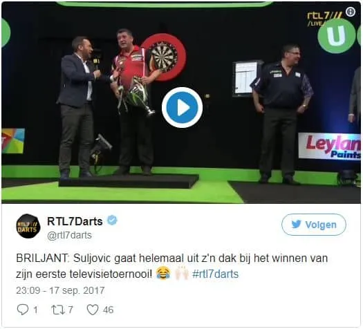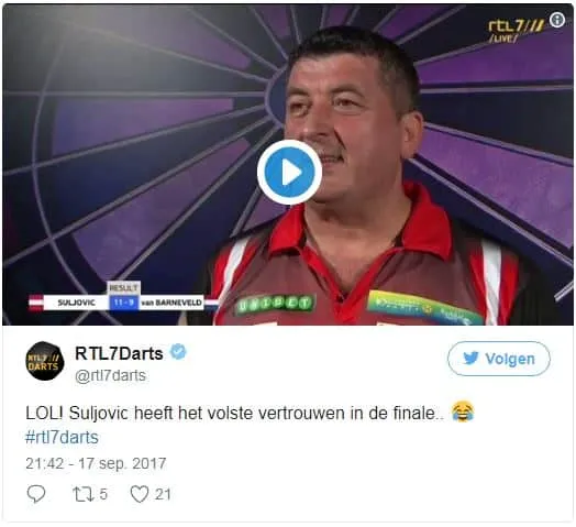 Raymond van Barneveld. De vraag was of hij dacht de titel te kunnen winnen. Daar waar ieder ander zelfverzekerd zou reageren met een volmondige 'ja' deed Suljovic het anders. Tegen zijn eigen verwachting in bleek hij dus toch in staat om de titel te winnen. Direct na de gewonnen finale werd er een poging gedaan om nog een interview af te nemen met de Oostenrijker. Maar uiteraard verliep ook dit niet vlekkeloos. De taalbarrière zorgde ervoor dat hij totaal niet reageerde op de vraag maar in plaats daarvan begon hij spontaan iedereen te bedanken van supporter tot sponsor. Ook achter de schermen werd er nog een interview afgenomen met de kersverse winnaar van de Champions League of Darts. Tegen de verwachting in verliep deze redelijk goed en men kreeg zowaar een paar antwoorden op de vragen die werden gesteld. Het interview eindigde echter wel op zijn Mensur's. Bekijk onderstaande