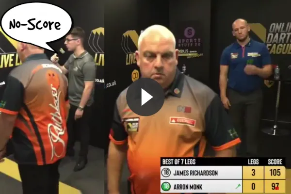 Arron Monk kon winnen. Bij een stand van 3-0 mocht hij aanleggen voor een 105-finish maar dit verliep niet zoals verwacht zoals te zien is op .