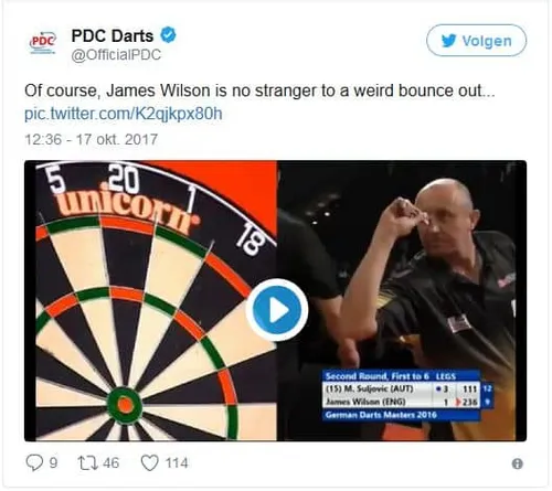Een jaar eerder had hij namelijk, eveneens tijdens een PDC-toernooi in Duitsland, ook al een bounce out zoals we die nog nooit eerder hadden gezien. Daar waar de derde dartspijl afgelopen weekend op zijn eerste dart bleef hangen presteerde hij het vorig jaar om zijn bounce out aan de nummers van het dartbord te laten hangen.