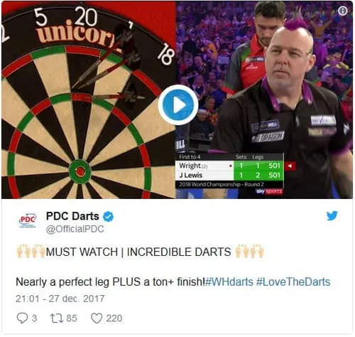 Jamie Lewis en Peter Wright wisten een prachtig duel uit te vechten waarbij Lewis met een gemiddelde van ruim 107,00 als winnaar uit de bus kwam. Er zaten heel veel belangrijke en mooie momenten in maar voor velen was de vierde leg in de derde set het hoogtepunt. Het is de beste leg van het PDC WK 2018 tot op heden.