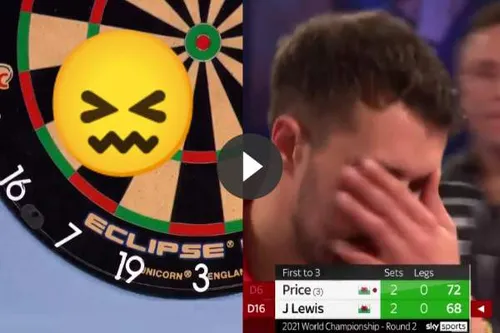 Gerwyn Price in de beslissende set. Het werd echter een een groot drama voor Fireball die zich op dat moment op knullige wijze 'dood' gooide. Dit pijnlijk moment waar Lewis vannacht nog een paar keer van zal zijn wakker geschoten is .