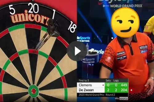 Jeffrey de Zwaan had een week geleden niet gedacht dat hij nu op de World Grand Prix zou spelen. Inmiddels heeft hij het al geschopt tot de kwartfinale en besloot de partij vrijdagavond in stijl af tegen Gabriel Clemens. Hij voorspelde zelfs zijn twee 180-ers in de afsluitende 10-darter zoals aan zijn gezicht is te zien is op .