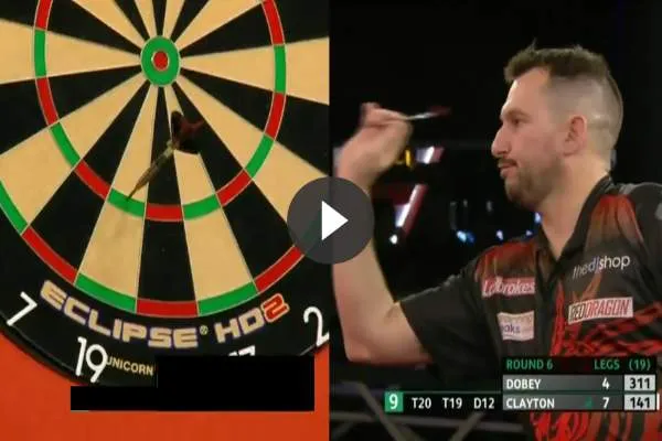 Zaterdagavond is Jonny Clayton erin geslaagd om een 9-darter te gooien op het tweede podium van de UK Open. Hij deed dit in zijn duel met Chris Dobey bij de laatste 16 en de beelden van zijn perfecte leg is vastgelegd op camera. Hieronder tonen we de beelden met een schitterende reactie van The Ferret. Uiteindelijk wist Clayton de partij met 10-8 ook te winnen en dus gaat zijn naam later vanavond weer in de ballenbak voor de loting.