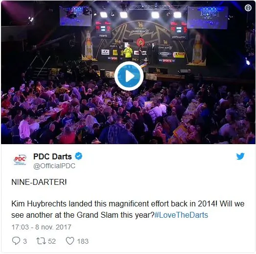 video van 3 jaar geleden. In de kwartfinale stonden Kim Huybrechts en Michael van Gerwen tegenover elkaar en ondanks een gemiddelde van 103,87 en 11 maximale scores voor de Nederlander was het Huybrechts die met 16-10 de winst zou opstrijken. Het hoogtepunt van de partij was de elfde leg waarin The Hurricane bij een stand van 13-7 een 9-darter wist te gooien. Beelden van deze perfecte leg zijn hieronder terug te kijken.