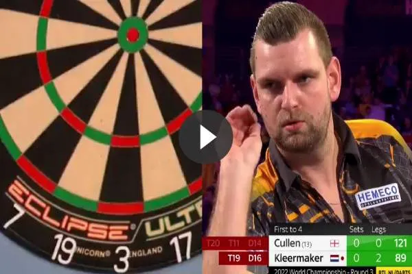 Joe Cullen op het WK vanmiddag. Hij had slechts iets meer dan 4 minuten nodig om de eerste set naar zich toe te trekken en deed dit bovendien in stijl. Hij gooide namelijk 89 uit op een wijze zoals we nog nooit zagen op een televisietoernooi. De opmerkelijke checkout is te zien op .