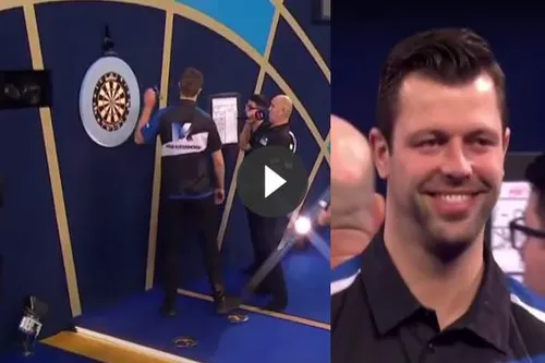 Zondagmiddag stond Maik Kuivenhoven tegenover Ky Smith en tijdens dit duel deed er zich een komisch moment voor tijdens de derde set. De Nederlander stond op 123 en werkte zich naar een dubbel toe waar hij zijn laatste pijl ook op mocht gooien. Het ging voor Russ Bray alleen allemaal iets te snel zoals te zien is op .