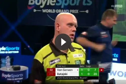 Michael van Gerwen wist Krzystof Ratajski te verslaan in de eerste ronde van de World Grand Prix maar eenvoudig ging het niet. De Pool bleef lang aanhaken en in de derde set was er een opmerkelijk moment waarbij Ratajski een misser van de Nederlander uitbundig vierde. Dit moment is te zien op .