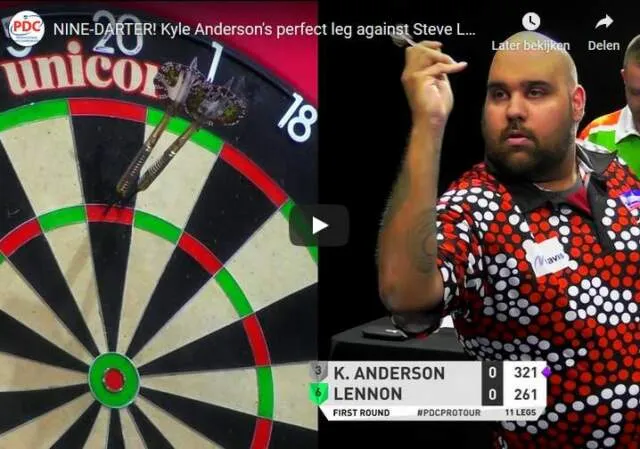 Kyle Anderson is er namelijk in geslaagd om een 9-darter te gooien. Hij deed dit in de eerste leg van zijn eerste ronde partij teven