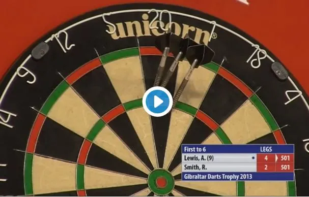 Adrian Lewis tijdens de Gibraltar Darts Trophy. We blikken terug op deze prestatie in de hoop dat deze spoedig niet langer de meeste recente 9-darter van de Euro Tour is.