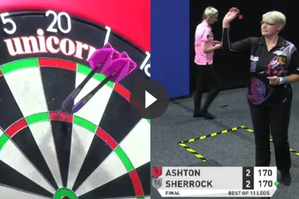 Fallon Sherrock tegenover elkaar in de finale. De dames stuwden elkaar en mochten in de vijfde leg allebei aanleggen voor een 170-finish. De latere winnares slaagde in deze opgave zoals te zien is op .