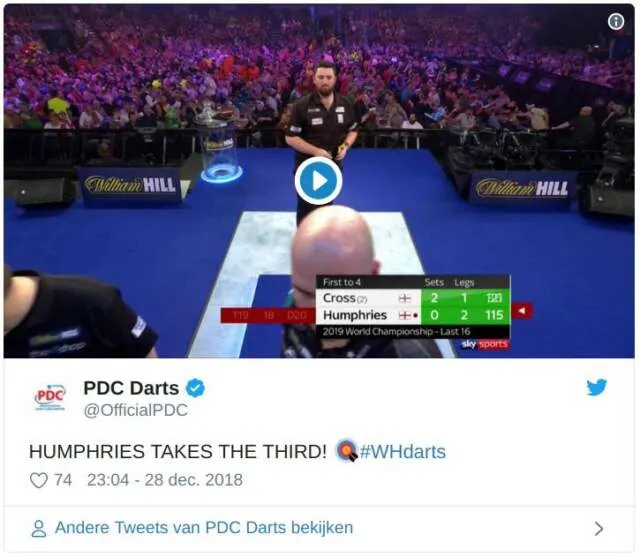 Het PDC WK 2019 is een toernooi van de verrassende uitslagen waarbij veel grote namen het hebben moeten ontzien. Vrijdagavond was het Rob Cross die de dupe werd van de nummer 90 van de wereld, Luke Humphries. Nog nooit had Voltage verloren op het podium in Alexander Palace en bij een 2-0 voorsprong in sets lag ook de kwartfinale alweer voor het oprapen voor de Engelsman. Maar Humphries had nog een verrassing in petto met een prachtige comeback zoals is te zien in onderstaande