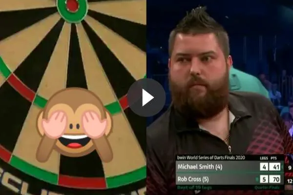 Michael Smith in zijn duel met Rob Cross. BullyBoy stond in één leg al na slechts 9 pijlen op 41 maar toen maakte hij een grote blunder zoals je kan zien op .