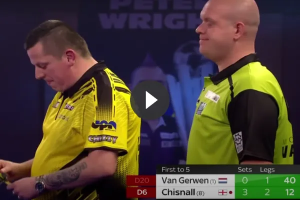 Maar dat de Nederlander er nog een schepje bovenop kan doen bewees hij in duel met Dave Chisnall. Het leverde een hilarische actie op waarbij de Engelsman dartles kreeg zoals te zien is op