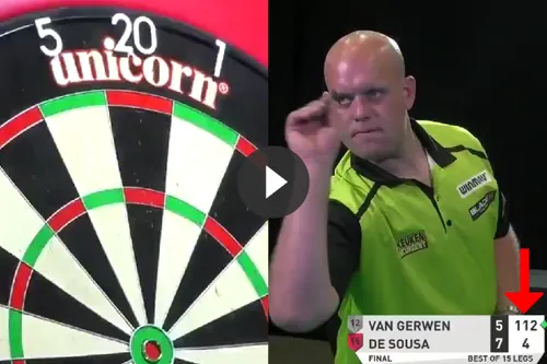 Op de PDC Super Series wist Michael van Gerwen een waanzinnige finish te gooien om in leven te blijven tegen Jose de Sousa. Het was een 112-finish wat op zich niet bijzonder is. Maar de manier waarop de Nederlander hierin wist te slagen is bijzonder te noemen zoals te zien is op .