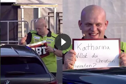 Deze week werd het Hannover Drive-In Darts Gala gespeeld. Michael van Gerwen won het toernooi maar hij had ook nog een verrassing in petto voor één van de toeschouwers. De Nederlanders helpt een grote fan met zijn huwelijksaanzoek zoals je .