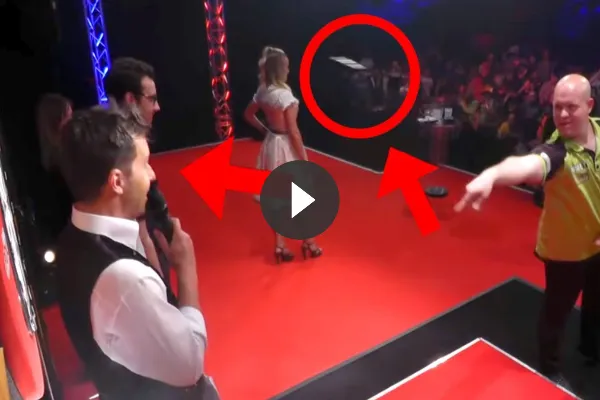 Dit deed hij recht voor het dartbord en dat moet je niet doen wanneer Michael van Gerwen wilt ingooien. De Nederlander trakteerde hem op een nogal spannende messen act zoals te zien is op