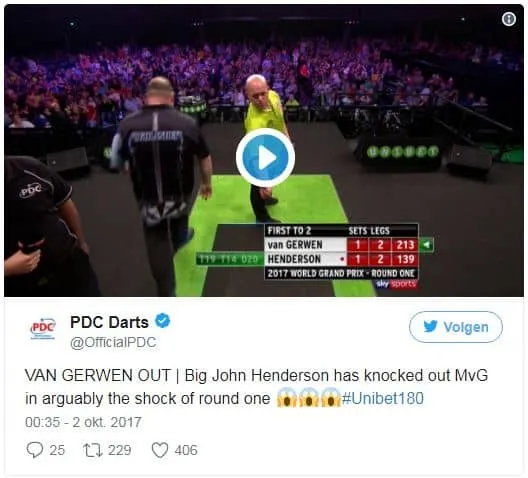 Het was hét moment van de avond waarop het misging voor Van Gerwen. Althans het had het moment moeten worden waarop hij de achterstand die hij eerder was opgelopen weer had moeten rechttrekken. Maar het gebeurde niet en dus was de sensatie compleet toen Henderson de nummer 1 van de wereld en de regerend wereldkampioen naar huis gooide in de eerste ronde van de World Grand Prix 2017.