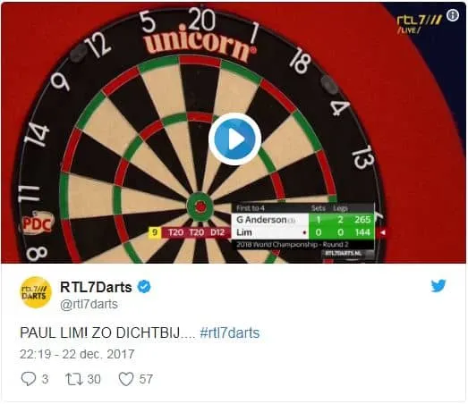 Gary Anderson miste hij de perfecte leg op dubbel 12. De leg wist Anderson uiteindelijk te pakken omdat de Lim de dubbel maar niet kon raken.