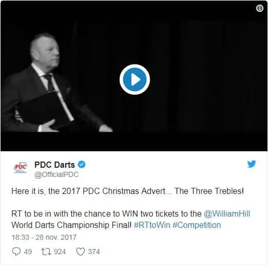 Sinterklaas staat nog voor de deur maar bij de PDC blikken ze al vooruit op het PDC WK 2018. Op 14 december gaat het wereldkampioenschap van start dat hand in hand gaat met de kerstdagen. Om hiervoor al in de stemming te komen heeft de PDC de jaarlijkse kerstvideo weer uitgebracht. Dit keer horen we de mastercallers Russ Bray, Paul Hinks en George Noble geen 'one hundred and eighty' roepen maar schrapen ze de stembanden voor een muzieknummer. Althans...