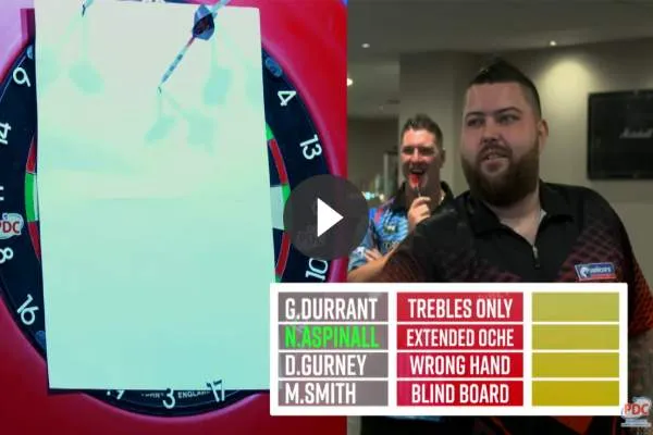 Michael Smith als eerste deelnemers van de partij zijn. Met hun eerste pijl gooien ze een willekeurig getal dat staat voor een uitdaging. Vervolgens krijgen ze allemaal 9 pijlen om hun uitdaging aan te gaan en degene met de hoogste score wint het spel. Hoe het de heren afgaat in dit nieuw bijzonder spel zie je in .