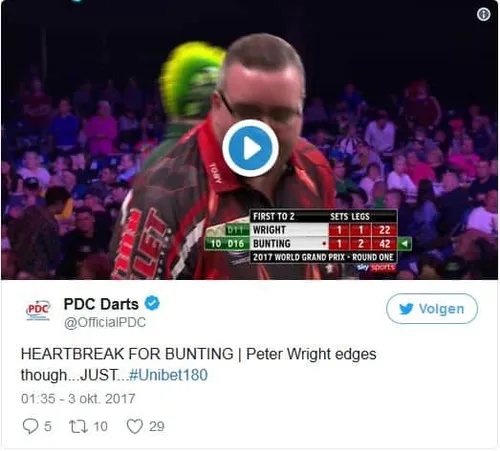 De World Grand Prix heeft al veel verrassingen opgeleverd waarin de top 10 spelers van de Order of Merit het erg zwaar hadden. Peter Wright was hierop geen uitzondering en bijna voegde hij zich bij Michael van Gerwen, Adrian Lewis, James Wade en Jelle Klaasen als verliezer in de eerste ronde. The Snakebite kreeg twee matchdarts tegen maar Bunting verzuimde om het af te maken.
