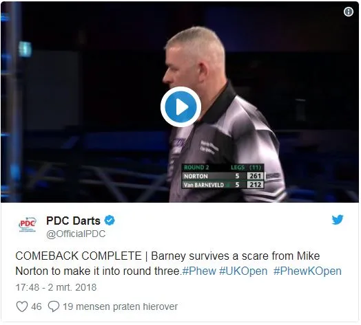 Raymond van Barneveld kwam goed weg in zijn tweede ronde partij tegen Mike Norton. De Engelsman kwam in deze partij op een 5-3 voorsprong en miste maar liefst 6 matchdarts. Barney wist zich toch nog een weg terug te vechten richting in beslissende laatste leg waarin hij op magistrale wijze alsnog de overwinning wist op te eisen. De winnende darts van de Hagenaar zijn hieronder te bekijken die daarmee alsnog de derde ronde wist te bereiken.