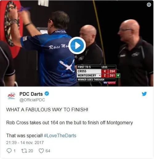 Rob Cross moest zijn partij tegen Ross Montgomery winnen om zich te plaatsen voor de laatste 16 van de Grand Slam of Darts. In de eerste leg miste hij 5 pijlen op de dubbel en kreeg vervolgens een 125-finish tegen. Daar waar sommige spelers van zijn stuk zouden raken werd Cross extra gemotiveerd en hij wist de partij dan ook alsnog naar zich toe te trekken. De manier waarop hij dit dient verdiende echter wel een apart artikel met een video. Hij besloot de partij namelijk met een 164-finish die je hieronder kunt terugzien.