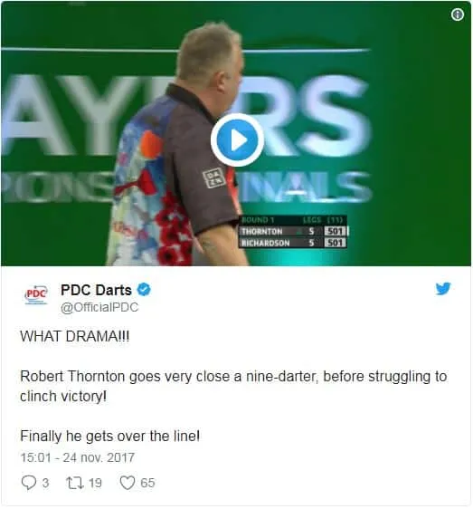 Robert Thornton wist vanmiddag zijn wedstrijd tegen Richardson bijna te besluiten met een 9-darter. De Schot was dicht bij een perfect einde van zijn wedstrijd maar de dubbel 12 werd gemist. Hieronder zie je de beelden van wat de eerste 9 darter in de geschiedenis van darten zou zijn waarmee een partij, live op televisie uitgezonden, zou worden besloten.