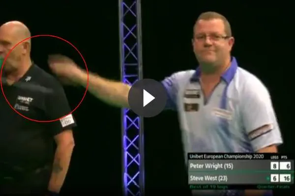 Vincent van der Voort op de World Matchplay. Kirk Bevans bepaalde als scheidsrechter in beide gevallen dat de pijl illegaal was gegooid en deze telden dan ook niet mee. Zaterdagavond stond Russ Bray op het podium en ook hij was niet blij met een onderhandse blinde worp van
