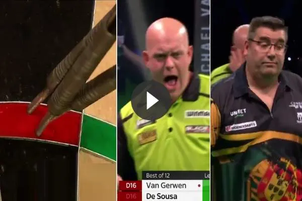 Jose de Sousa wisten woensdagavond een prachtig duel af te leveren op de Premier League. De heren stuwden elkaar naar grote hoogte waarbij de Nederlander de partij opende met een schitterende 125-finish op bull. Het hoogtepunt kwam echter in de zevende leg toen de heren 14 perfecte pijlen gooiden. Het feit dat Van Gerwen uit zijn plaat gaat en De Sousa zijn schouders ophaalt maakt het helemaal af zoals te zien is op .