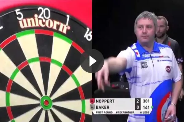 Nathan Aspinall bij. Slechts 1 werd er gegooid op een baan die is voorzien van camera's. Hieronder brengen we de beelden van de eerste 9-darter op camera in 2020.
