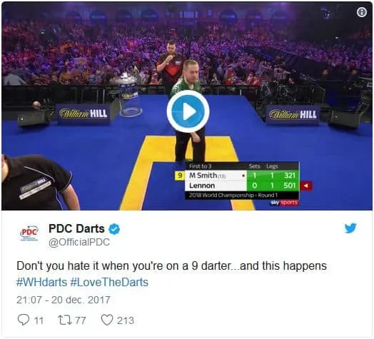 Michael Smith kreeg in zijn partij tegen Lennon een Robin Hood op een wel heel vervelend moment. Hij had namelijk een '9' voor zijn naam staan en was dus op weg naar een mogelijke 9-darter. Tot overmaat van ramp eindigde de pijl daarna nog op de grond ook vanwege een bounce out. Beelden van deze ongelukkige 9-darter poging zijn hieronder te bekijken.