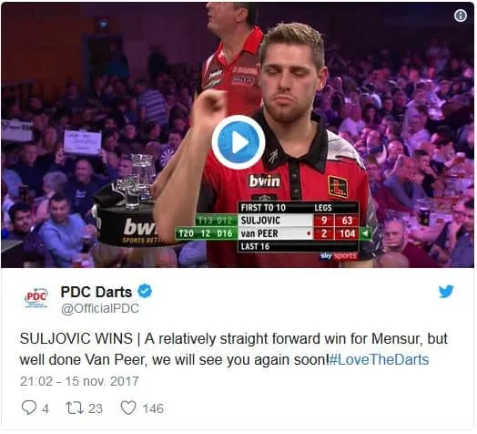 De wedstrijd tussen Mensur Suljovic en Berry van Peer was er één waar velen naar uitkeken. De Oostenrijk had de Nederlander gedurende de Grand Slam of Darts geholpen om met zijn darteritus om te kunnen gaan, maar het lot bepaalde dat ze zij de laatste 16 tegen elkaar moesten spelen. Suljovic speelde de eerste helft van de partij briljant en het gemiddelde kwam lange tijd zelfs boven de 117,00 uit. Van Peer speelde met 95,39 gemiddeld ook zeer sterk maar desondanks kwam er een geflatteerde 10-2 eindstand op het scorebord te staan. Toch konden de twee het goed met elkaar vinden, zo bleek ook na de winnende pijl. Suljovic gooide een 63-finish uit zoals we het nog niet eerder zagen en Van Peer gooide er voor de grap een 'Head Butt' in waar de Oostenrijker bekend om staat.