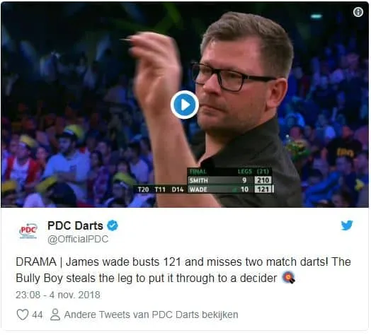 James Wade kende een riante voorsprong in de 20e leg en mocht aanleggen voor de titel vanaf een 121-finish. Hij wist zich echter nog in de nesten te werken door zich 'dood' te gooien met een score van 127.