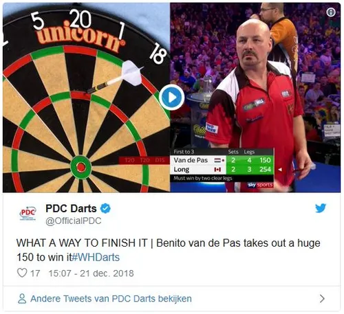Benito van de Pas heeft op sensationele wijze de thriller van Jim Long gewonnen in een tie-break. De Nederlander overleefde een matchdart en besloot vervolgens de partij op magistrale wijze. Bekijk hieronder de beelden.