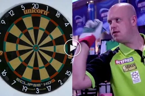 Na de was het nu de beurt aan Michael van Gerwen. Opmerkelijk genoeg gooide hij zijn pijlen met de zware werkhandschoenen beter dan zonder.