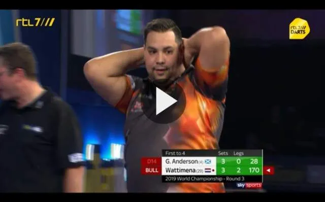 Michael van Gerwen gooien maar deze was in het niet geval bij onderstaande poging. Wattimena knokte zich namelijk terug in de partij en kreeg zelfs een matchdart vanaf 170 om The Flying Scotsman in stijl naar huis te sturen.