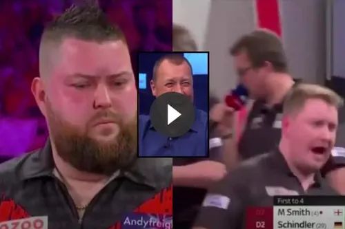 De laatste partij van woensdagavond ging tussen Michael Smith en Martin Schindler. Op een moment dat het er nog helemaal niet om deed ging de Duitser uit zijn plaat bij het gooien van een dubbel. Toen Wayne Mardle de reactie van Michael Smith hierop zich ging de commentator helemaal stuk zoals te zien is op .