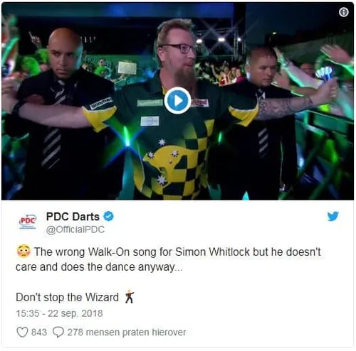 Op de Champions League of Darts speelde Simon Whitlock de eerste ronde tegen Peter Wright. Maar nog voordat de partij begonnen was ging het al mis voor de Australiër. In plaats van zijn vertrouwde opkomstnummer 'Down Under' klonk het nummer 'Don't stop the party' van Peter Wright door de speakers. Whitlock reageerde in eerste instantie verbaasd maar besloot om het bijbehorende dansje van Peter Wright dan maar te imiteren.
