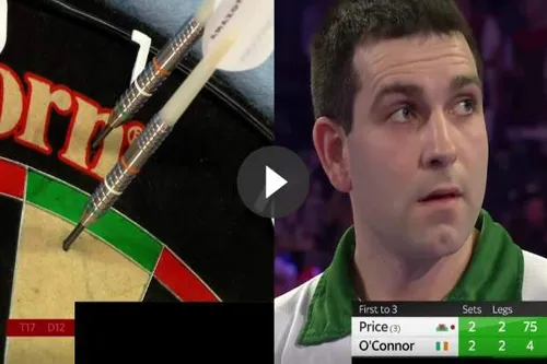 William O'Connor had donderdagavond de kans om Gerwyn Price vroegtijdig naar huis te sturen. Hij bracht de partij naar een tie-break bij een stand van 2-2 in sets en 2-2 in legs. Maar toen deed er zich een bizar moment voor op een wel heel pijnlijk moment voor de speler uit Ierland. Hieronder brengen we de beelden van dit moment waar O'Connor vannacht nog wel van wakker zal zijn geschoten.