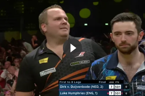 De Nederlander maakte kans op zijn eerste PDC Euro titel en Luke Humphries legde aan voor zijn vijfde. Beiden kregen pijlen voor de titel zoals te zien is op deze beelden.