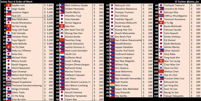 Hieronder staat de Asian Tour Order of Merit na zes van de twaalf toernooien. Na twaalf toernooien zal de top 4 zich verzekeren van deelname aan het PDC WK in Alexandra Palace.