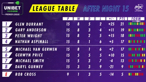 Vanavond zal er worden gestreden om de laatste plekken voor de play-offs en alleen Glen Durrant is op dit moment zeker van deelname. Gary Anderson kan in theorie plaatsing 09nog mislopen ondanks zijn huidige tweede plek al lijkt dit niet realistisch.