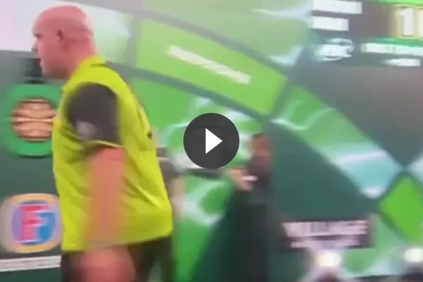 Vincent van der Voort is een goede vriend van Michael van Gerwen maar zelfs hij kon bij het zien van de beelden zijn lach niet inhouden. Het deed zich voor bij een voorsprong van 3-1 in sets voor de Nederlander al zou je bij het zien van de beelden denken dat het eerder andersom het geval was.