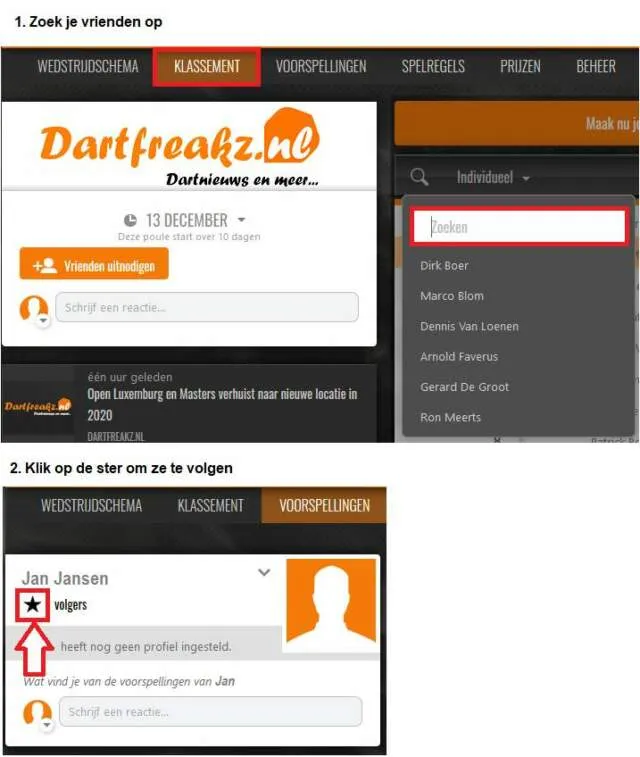 www.poules.com/dartfreakz of download de Poules.com App en zoek op '